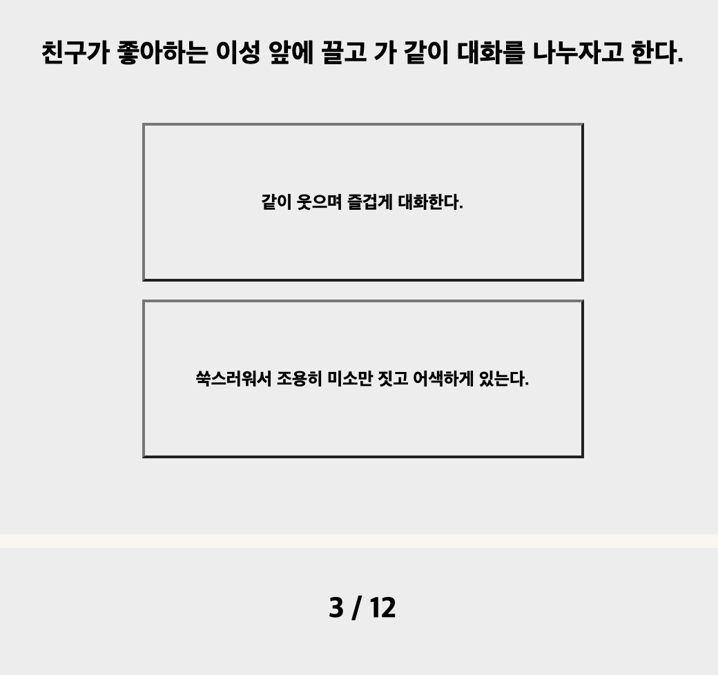 좋아하는 이성 앞에 끌고가 대화를 하자고 한다.. 어색하게 있으면 상대방이 눈치 챌수도 있어요 ㅋㅋㅋ