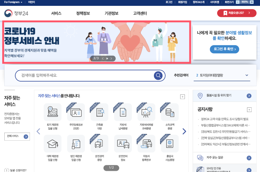먼저, 정부24 홈페이지(www.gov.kr/portal/main)에 접속하고, 상단 메인 배너의 클릭합니다.