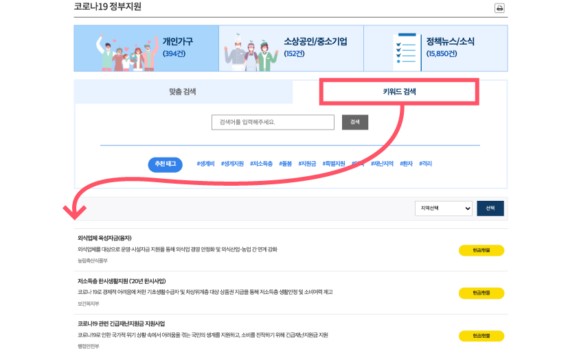 만약 "들은 정부지원이 있는데, 세부사항을 알아보고 싶다."는 분들은 키워드 검색을 통해 빠르게 확인하실 수 있습니다.(하단 이미지 참조)