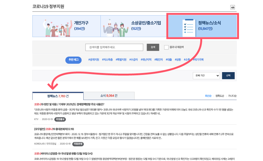 또한 정책뉴스/소식 탭에서는 코로나19와 관련된 정부의 공식적인 뉴스와 소식만 모아서 확인할 수 있습니다.(하단 이미지 참조)