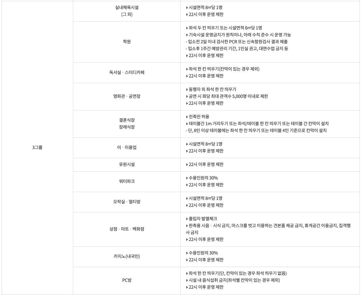 1 ,2그룹에 속한 시설은 모두 22시 이후 운영에 제한이 있습니다.