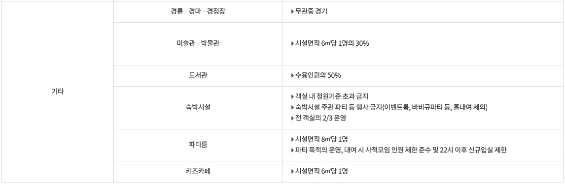 기타 시설에 속한 미술관, 도서관, 숙박시설 등은 인원에 제한을 두고 있습니다. 숙박시설의 경우 전 객실의 2/3만 운영이 가능하고, 도서관도 수용인원의 50%만 이용이 가능합니다.