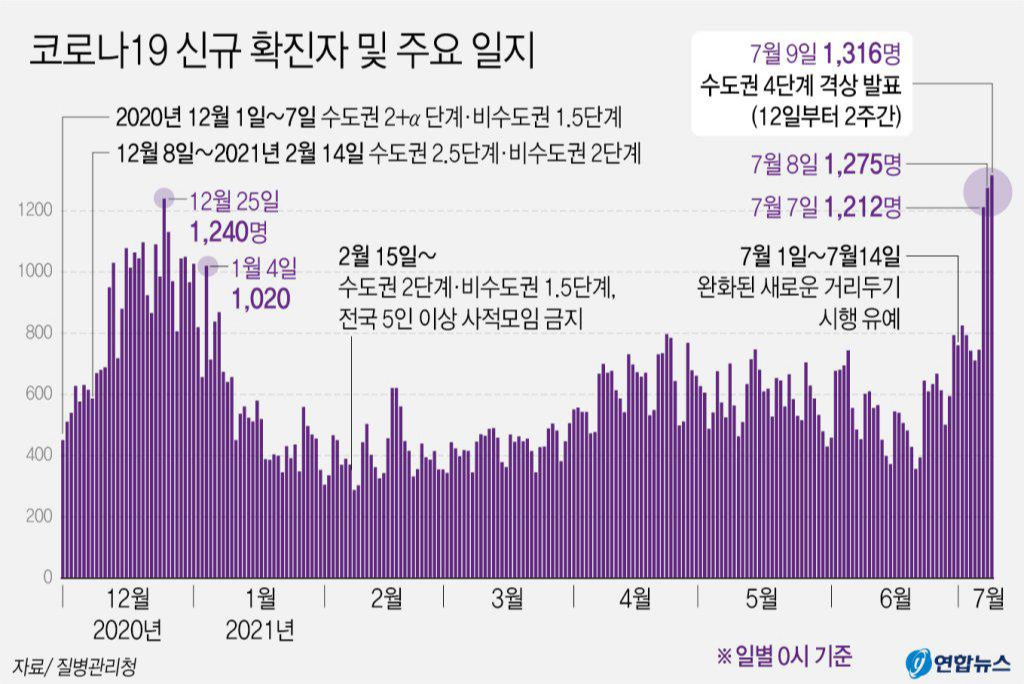 작년 12월 25일 1240명으로 최대확진자가 나온 이후 1월 이후부터 1000명대 이하를 유지해오다가, 완화된 거리두기 시행예정일이던 7월에 들어서 급격하게 확진자 수가 늘었습니다.