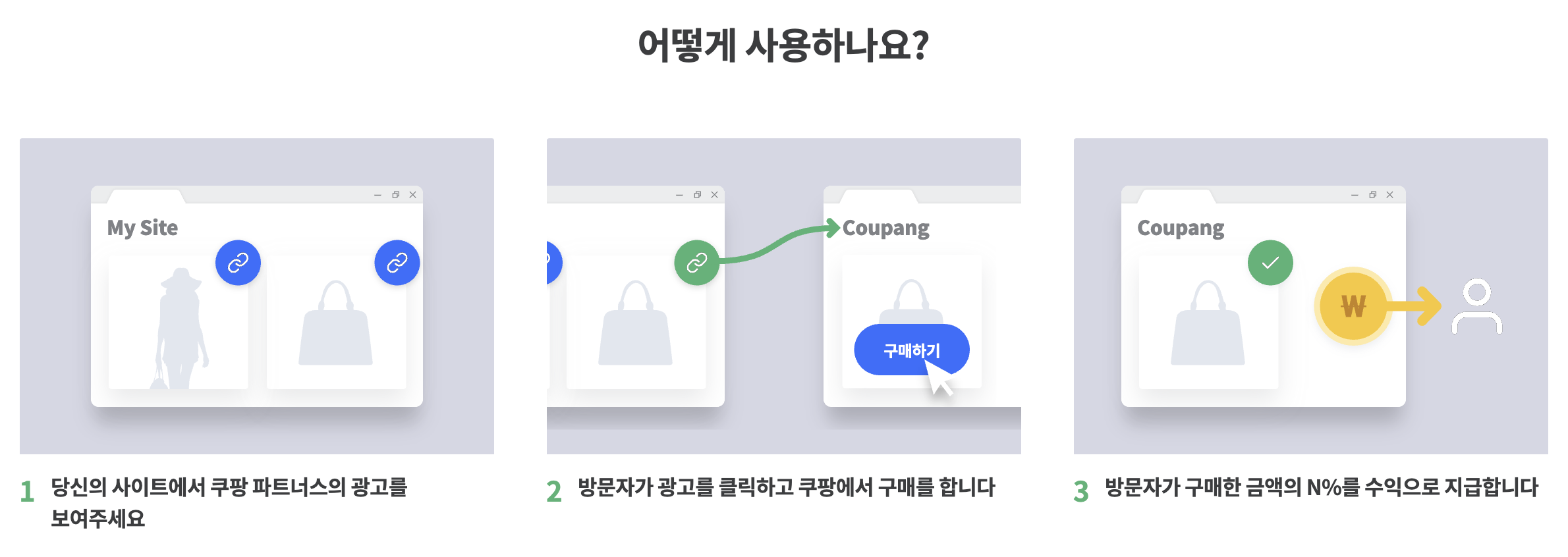 쿠팡에 등록된 상품의 링크를 생성하고, 이 링크를 통해 제품에 판매가 이루어지면 수익의 일정 수수료(3%)를 받아가는 제휴마케팅의 하나에요! (다시 한번 느낍니다..정말 똑똑한 쿠팡) 쿠팡 파트너스는 가입도 까다롭지 않고, 심사도 없어서 누구나 접근할 수 있어요. 가입하고, 링크생성하고, 링크를 붙여넣으면 끝!