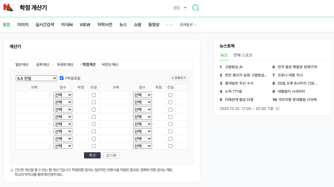 네이버 검색 창에 <학점 계산기>라고 치면 이렇게 가장 윗줄에 학점 계산기가 나옵니다.