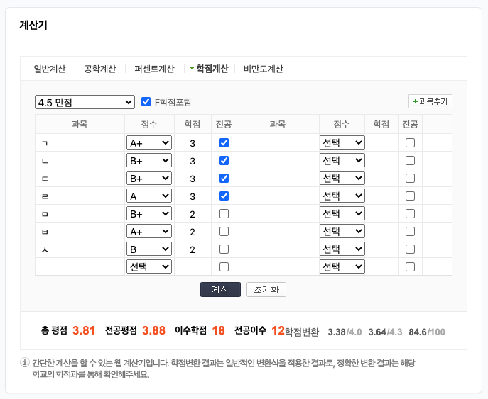 또한 다른 학점 기준으로도 몇 점이 나오는지도 알 수 있어요.