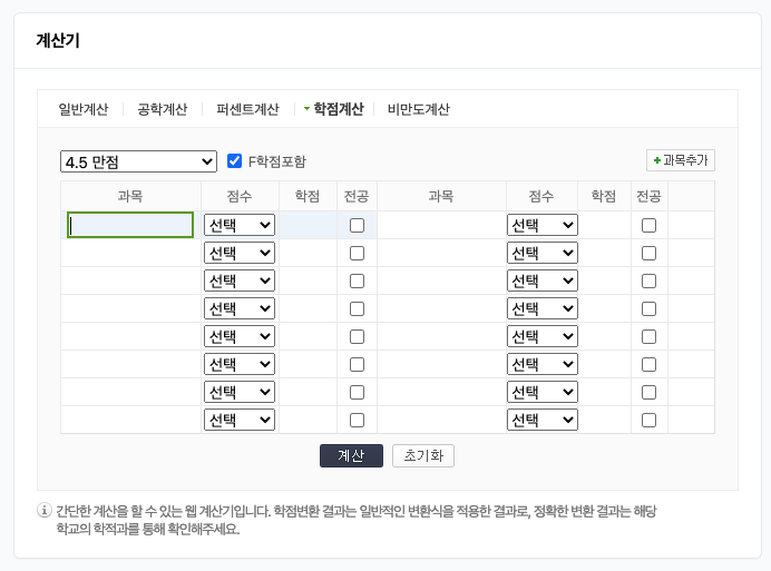 과목을 입력하고, 점수를 선택하고 학점을 입력합니다.
