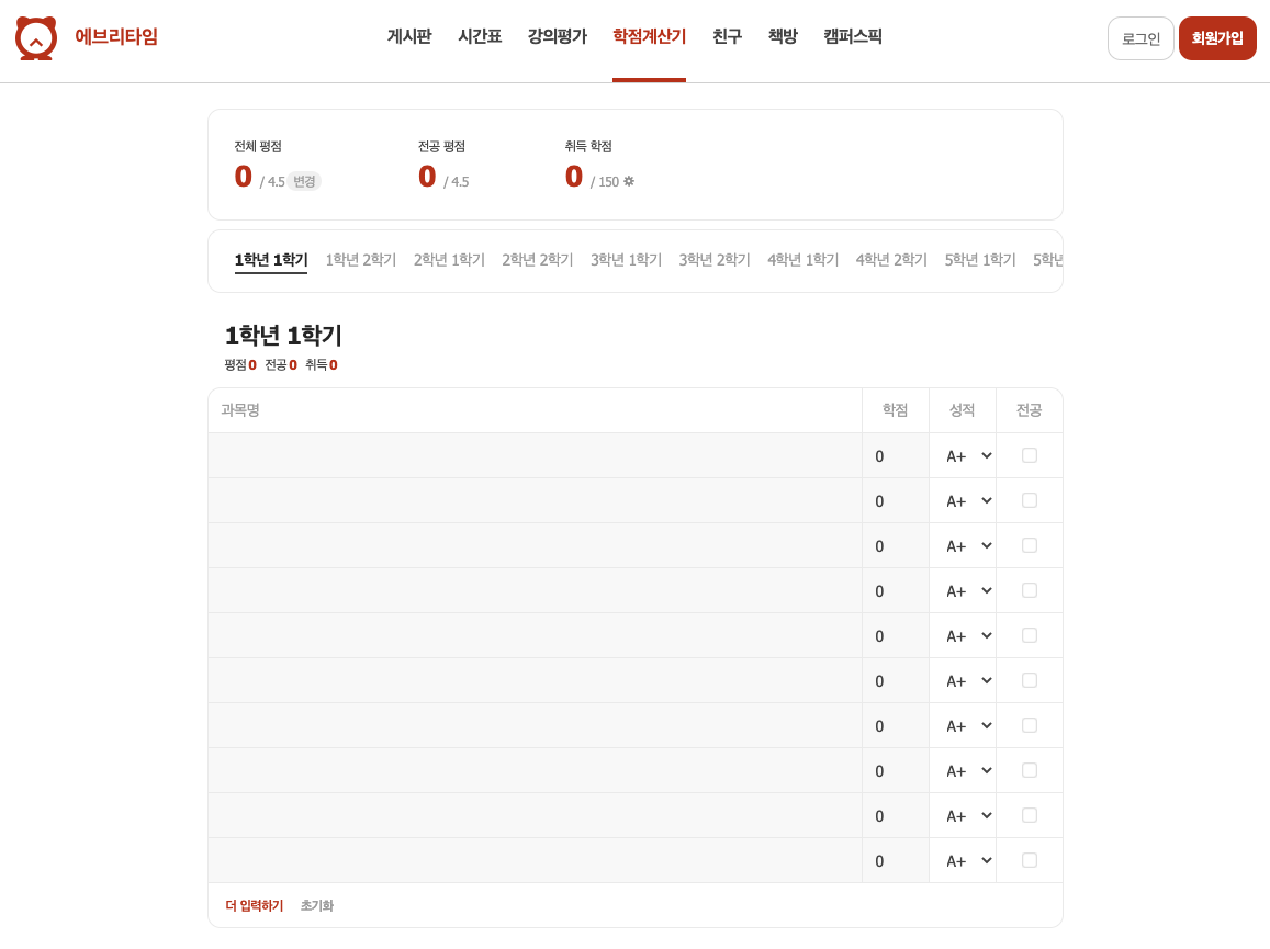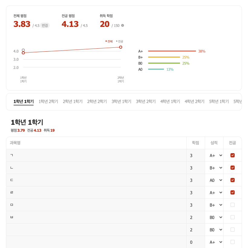 각 학기별로 과목, 학점, 성적, 전공여부를 입력하면
