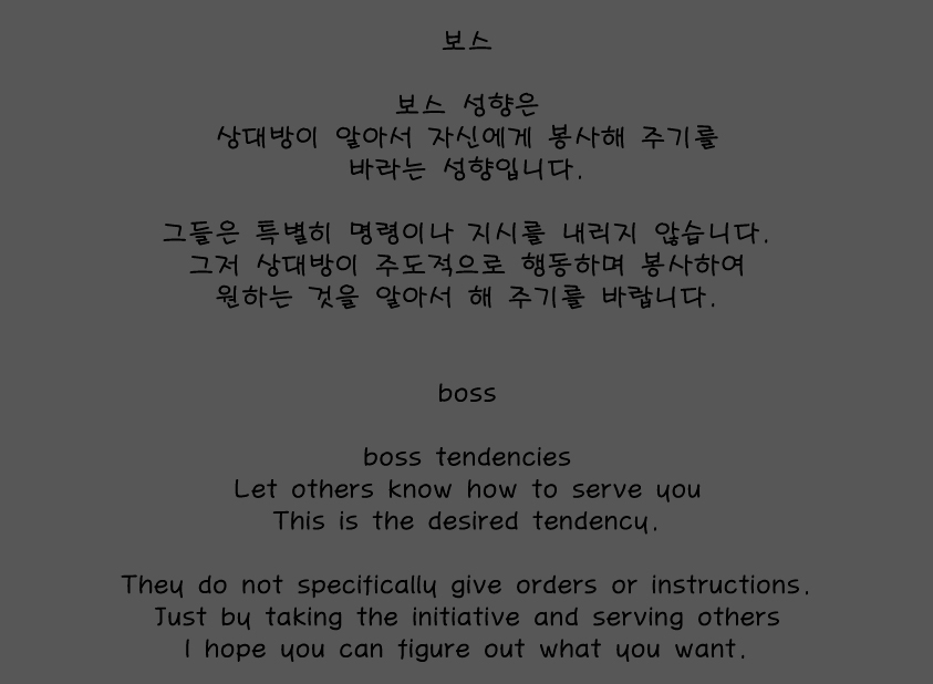 보스 성향은 수동적이지만 지배적인 이중적인 타입입니다.