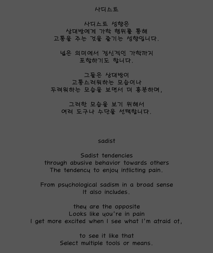 정신적으로나 육체적으로나 파트너가 고통스러워하는 모습을 보면서 흥분하는 성향입니다.