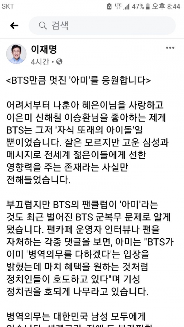 이 이후로 정치권에서는 "군대를 가겠다."는 방탄소년단 멤버들을 지지하는 분위기로 돌아섭니다.