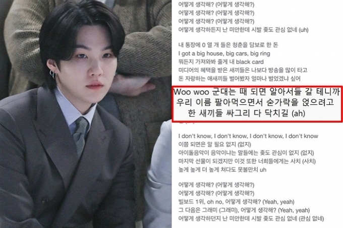 특히 BTS 멤버 슈가는 2020년 6월에 발매한 자신의 두번째 믹스테잎 'D-2'의 수록곡 '어떻게 생각해?(What do you think?)에서도 자신의 군입대 의견을 강하게 피력했습니다. 노래의 가사에서 "군대는 때 되면 알아서들 갈 테니까 우리 이름 팔아 먹으면서 숟가락 얹으려고 한 x끼들 싸그리 다 닥치길"이라고 소리쳤습니다.