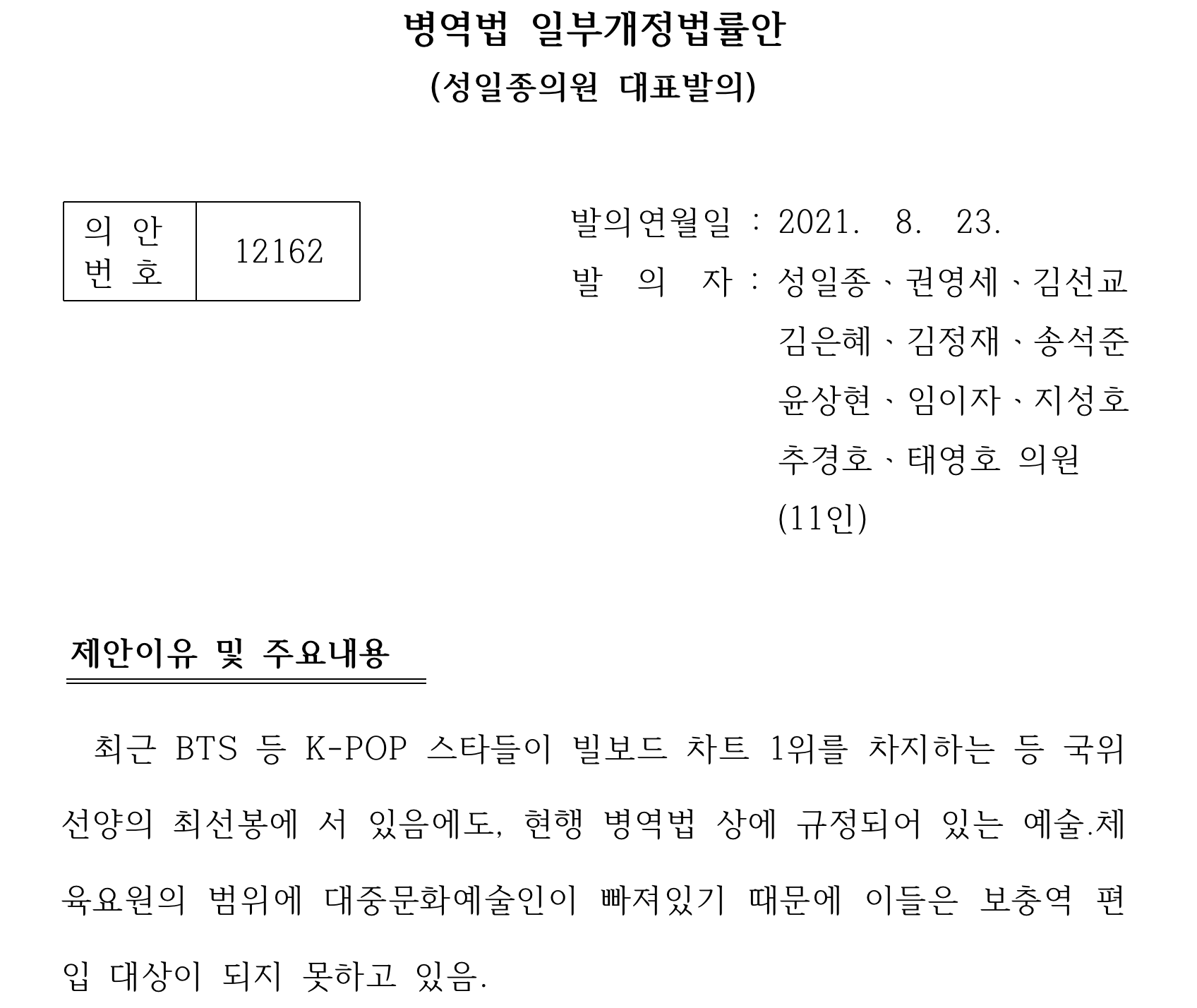 국회 국방위원회 간사로 있는 성일종 의원이 "첫번째는 공평한가의 문제이고 2번째는 국가의 도움이 어떤 게 큰가, 국익이 어떤 것이 도움이 되는가의 문제"라고 짚고 " 정서적인 측면에서는 우리 청년들이 다 함께 복무를 해야 한다고 하는 것에는 동의한다"라고 말하면서도, "현재 병역특례를 받고 있는 예술인이나 체육인들에 관한 항목은 42개 정도인데 그래미, 빌보드, 어메리칸 뮤직어워드 등 세계 팝을 주도 하고 있거나 문화를 주도 하고 있는 데서 우승을 했을 경우는 이 항목에 안 들어갔다"라며 "당시 이 법을 만들 때 우리 젊은이들이 비틀즈 같은 유명한 스타들을 내놨던 팝의 시장에서 우승한다는 것은 아예 상상을 안 했던 것이고 제도에 미비점이 있어서 이런 곳에도 혜택을 가는 게 좋겠다 라고 하는 판단을 한 것"이라고 설명했습니다.