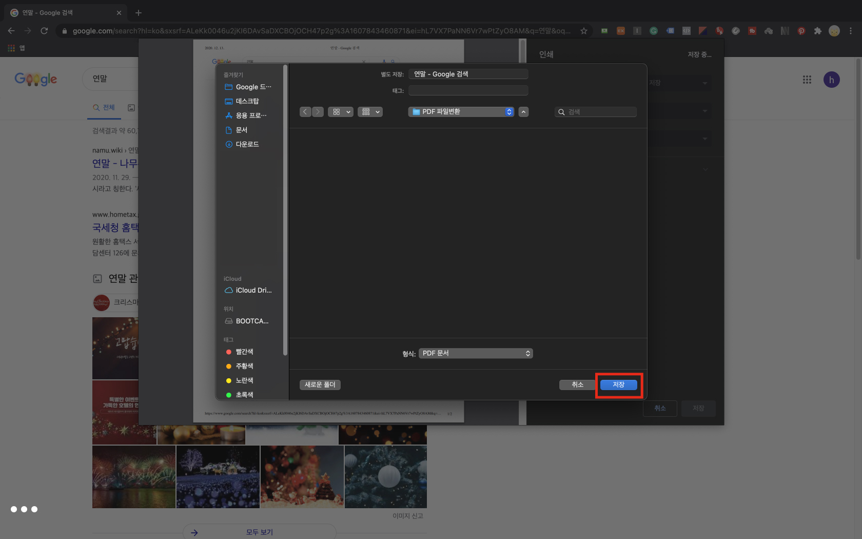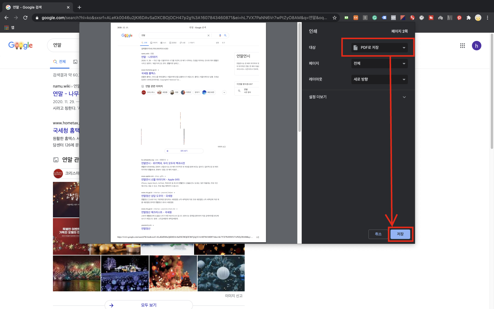 크롬 브라우저를 이용한 방법은 웹 상의 사이트를 PDF 형태로 저장하는 방식이다.