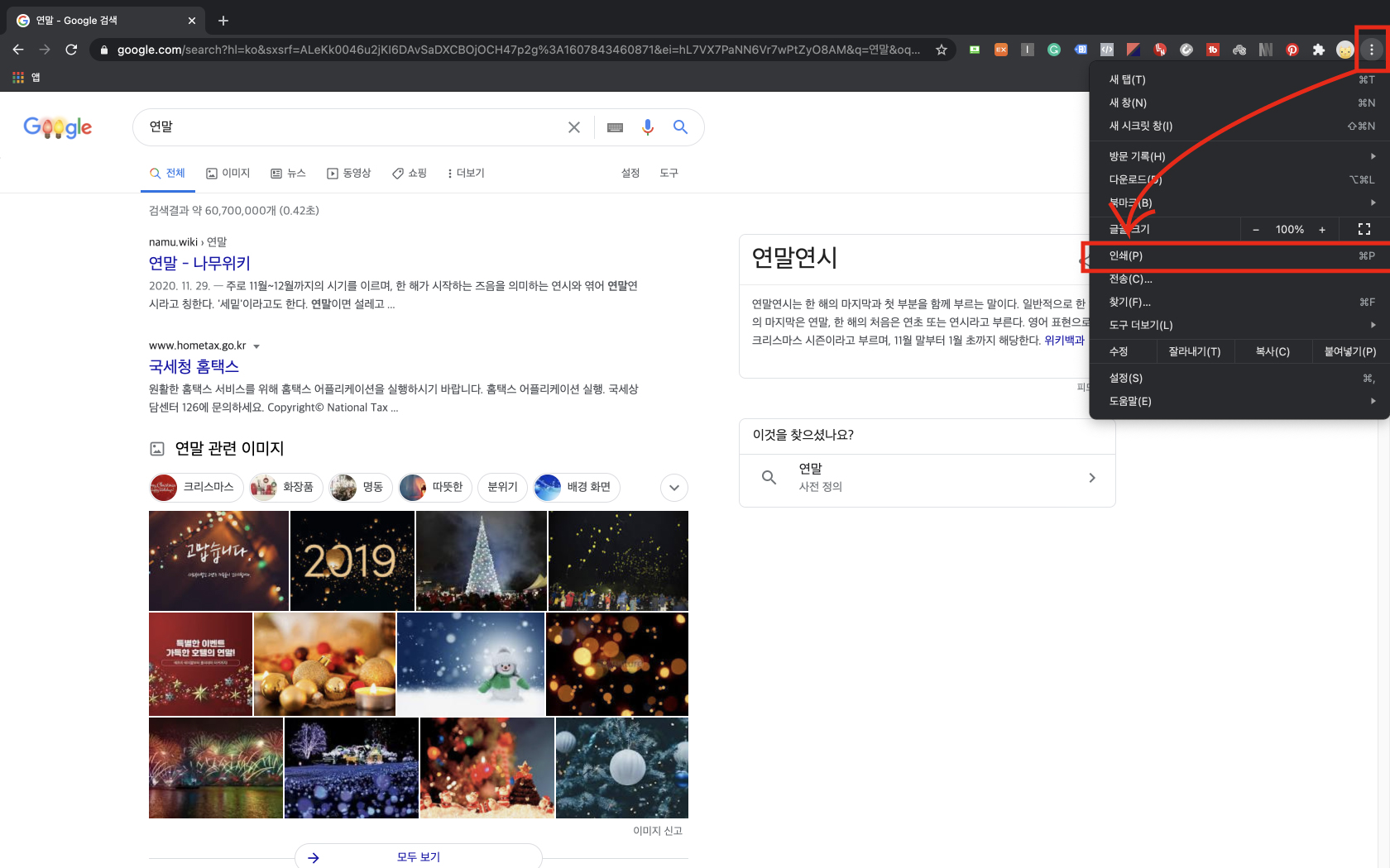 1. 브라우저 상단 오른쪽에 점3개 버튼을 클릭하고, 인쇄버튼을 클릭한다.