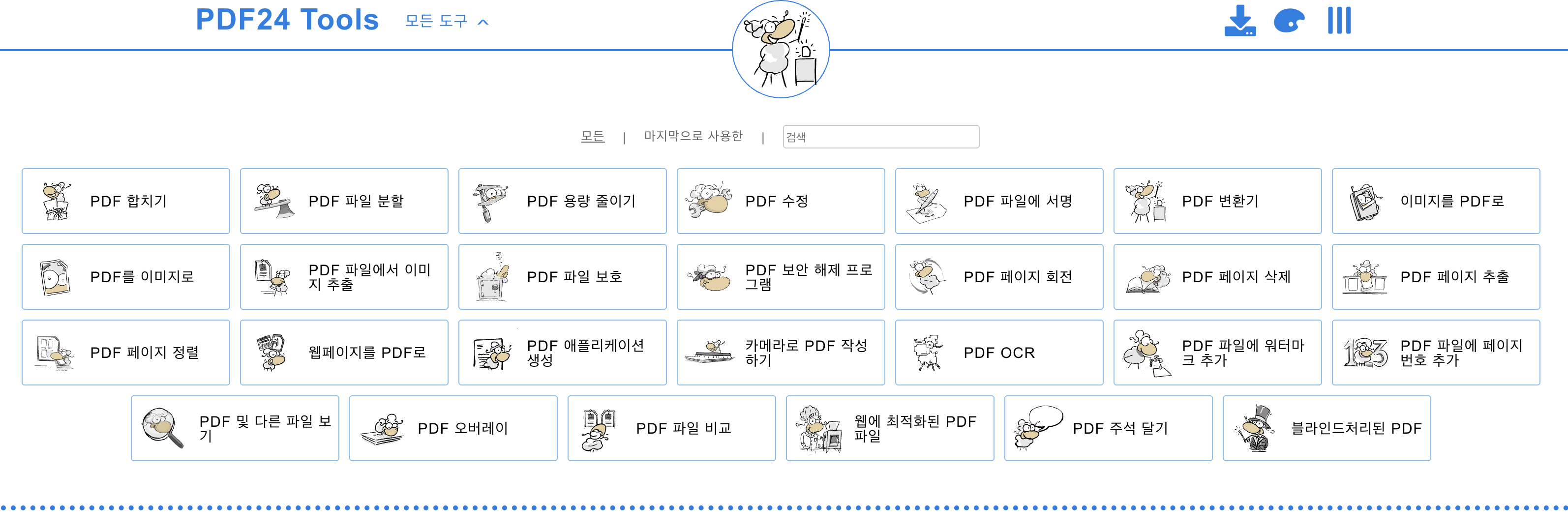 PDF24 Tools는 간단한 버튼 클릭으로 변환 서비스를 제공한다. 상단의 <모든도구>를 클릭하면 합치기, 분할, 용량 줄이기 등 다양한 서비스를 확인할 수 있다.